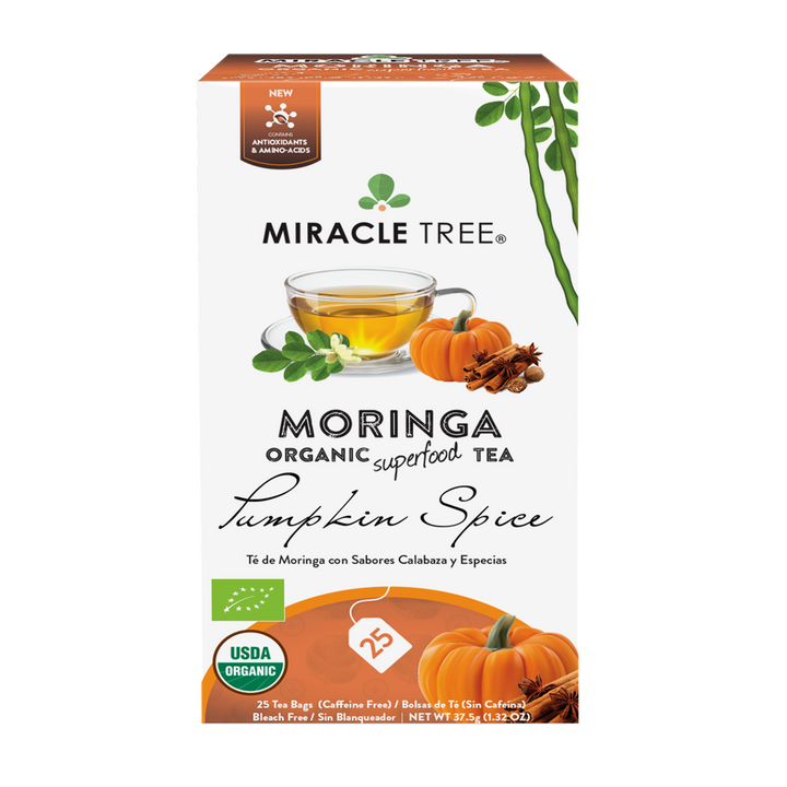 25 WRAPPED TEA BAGS, ORGANIC MORINGA LEAF, NON-GMO, CAFFEINE-FREE, & ABSOLUTELY DELICIOUS. ORGANIC MORINGA TEA, PUMPKIN SPICE: Miracle Tree's Pumpkin Spice Organic Moringa Superfood Tea is a delicious herbal tea blend that combines traditional holiday spices including Cinnamon, Ginger, Cardamom, Clove, Pumpkin flavors - and, of course - the superfood qualities of Moringa. Enjoy every sip and delight in the winter season!